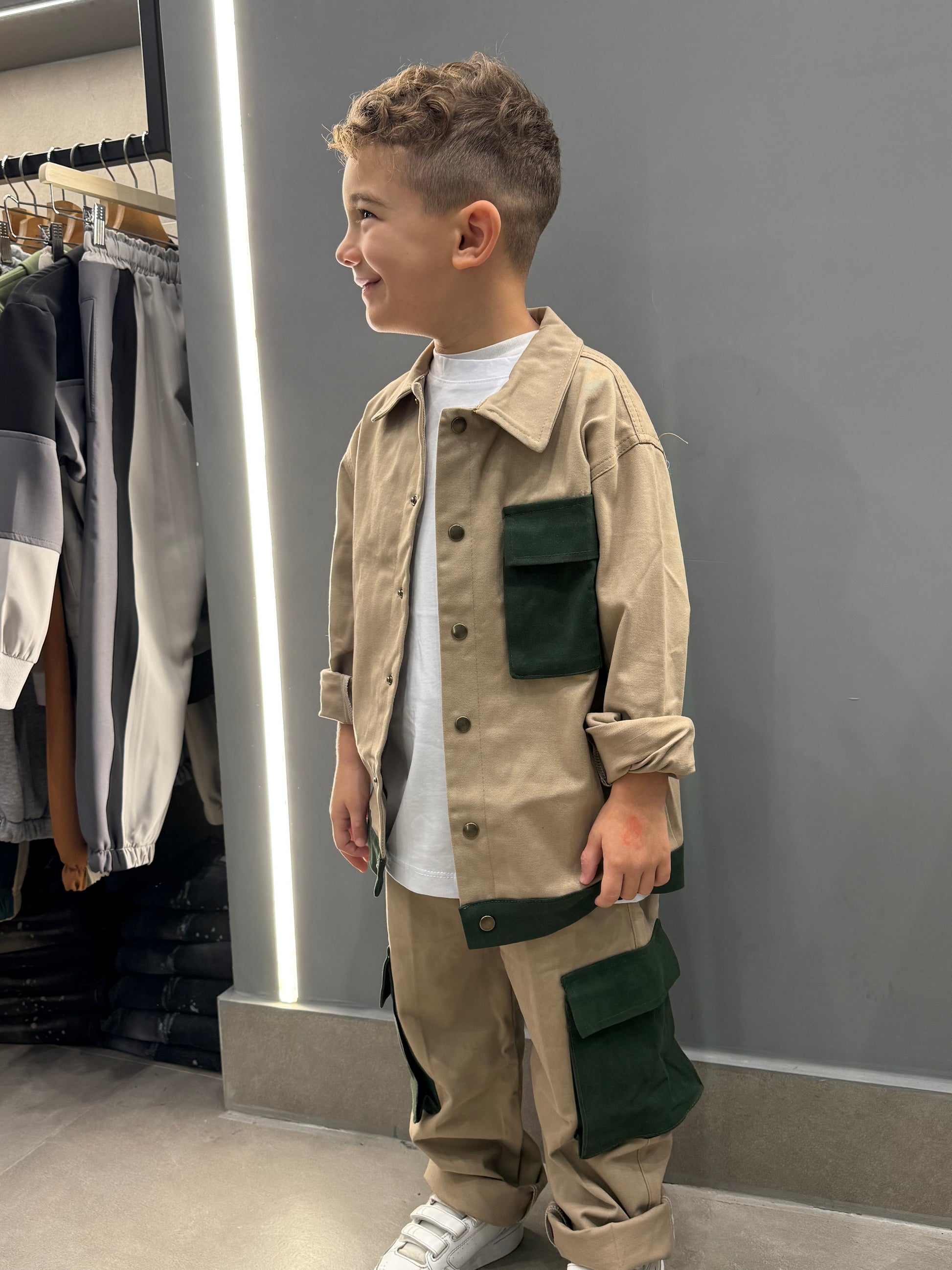 completo beige con tasconi verde